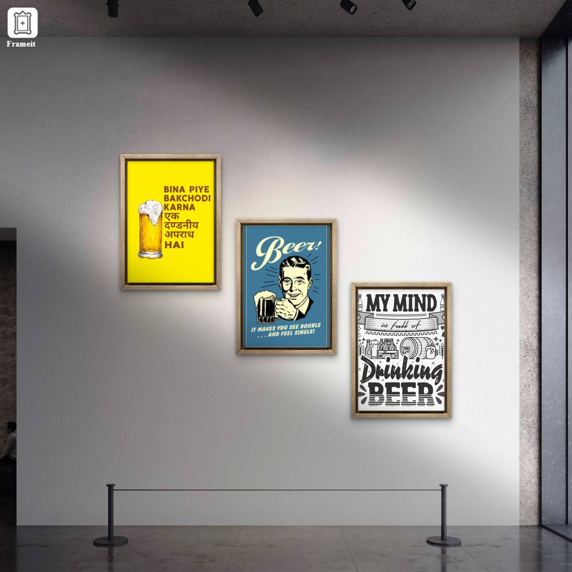 RangDeWalls Set of 3 Funny Beer Quotes Wall Art – 12x18 Inch Light Brown Wooden Frames | Quirky Bar Decor | Retro & Hindi-English Beer Posters for Wall